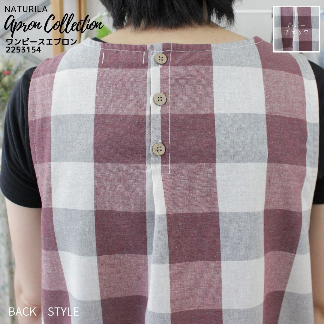 マスタードチェックとルビーチェックの2色展開、綿混素材で着やすくかわいいデザインのワンピースエプロンです。