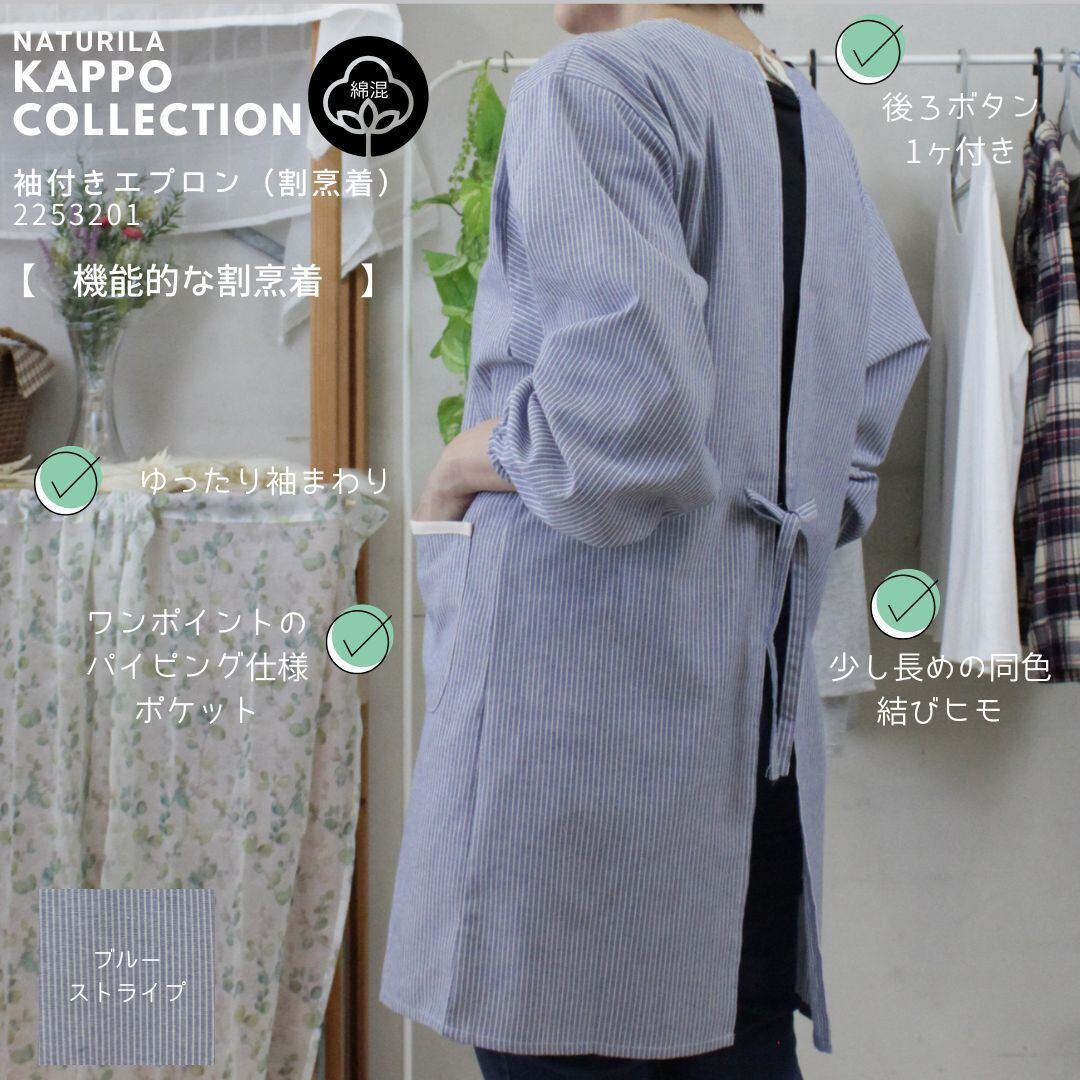 グレーストライプとブルーストライプの2色柄展開で細かいストライプ柄がかわいい袖付きエプロン(割烹着)です。