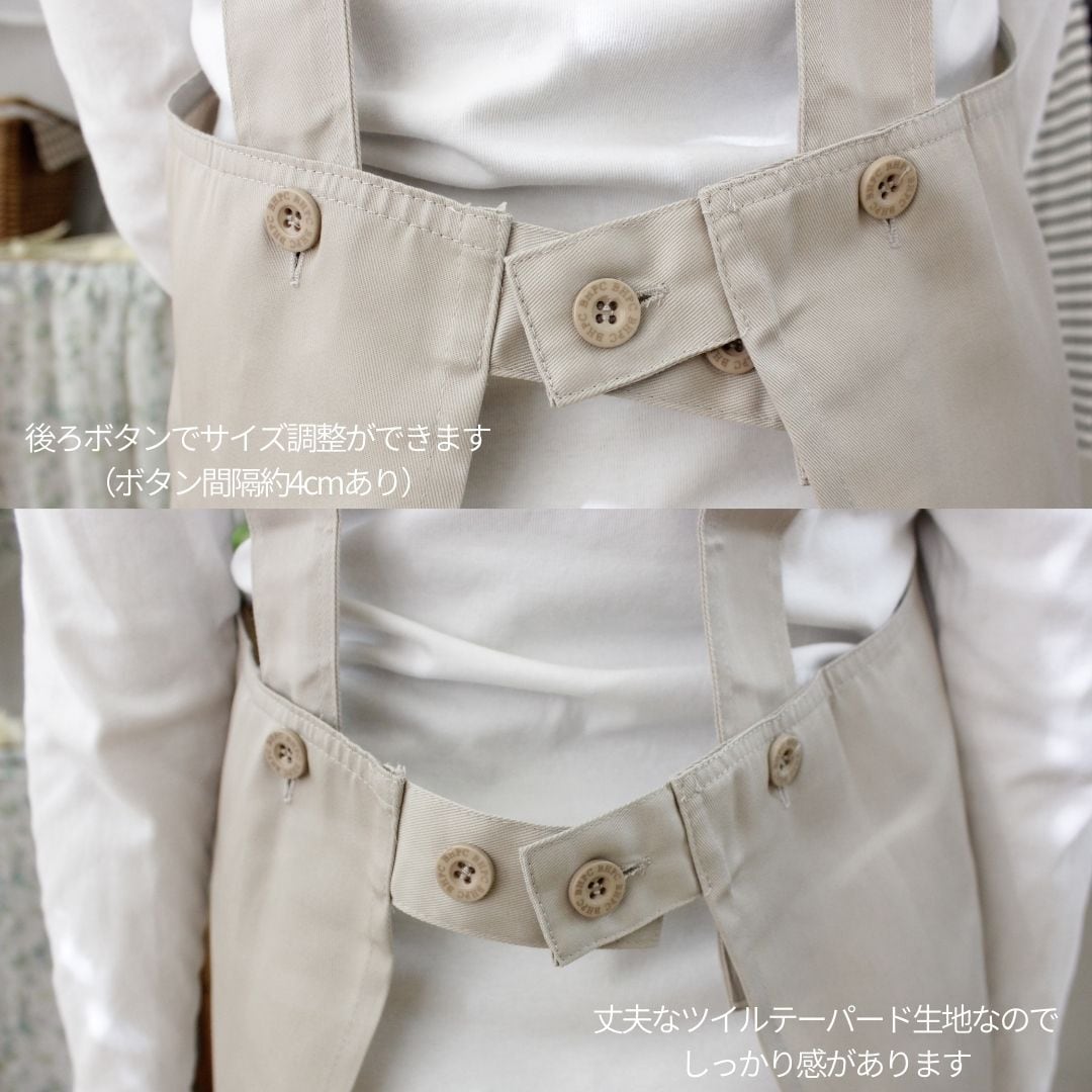 後ろボタンの留め位置でウエスト寸法が調整できてゆったり着心地。