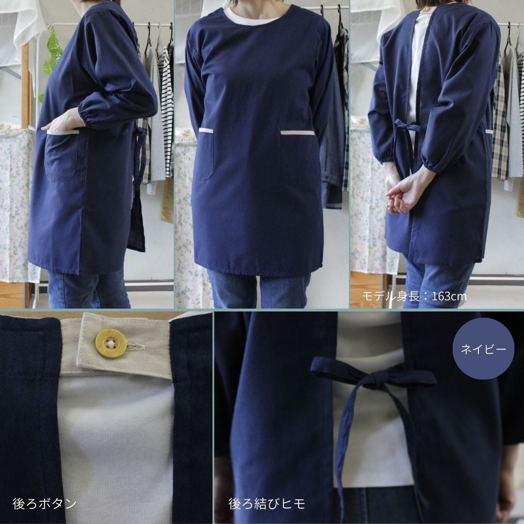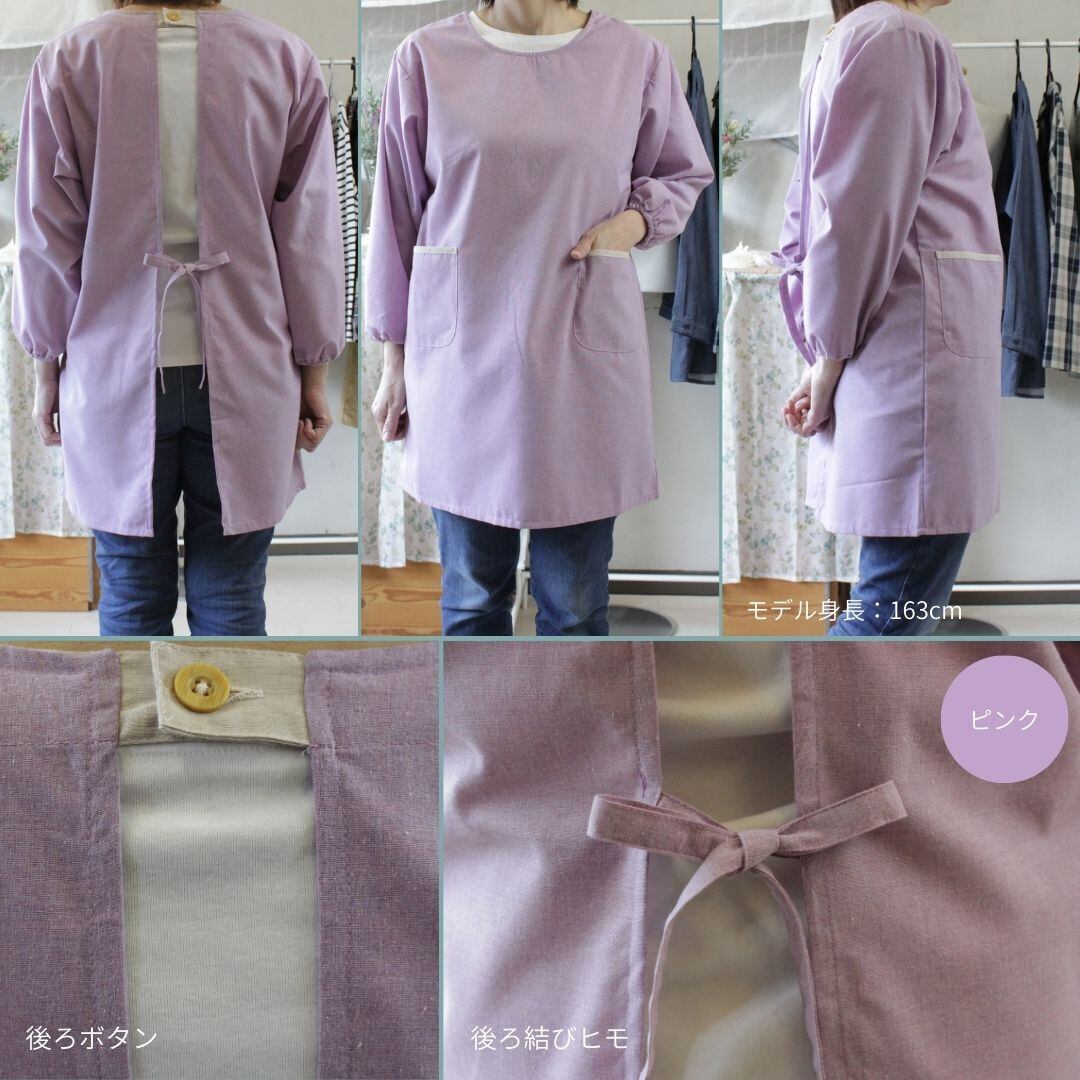 エプロン 割烹着 袖付きエプロン ホームウェア 保育士エプロン 後ろ結びヒモ 後ろボタン1ケ 前ポケット付
