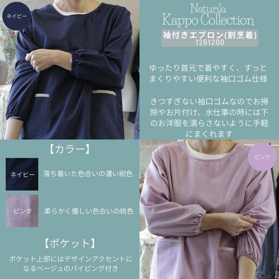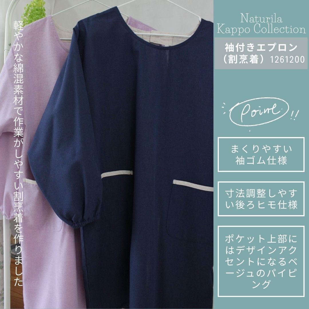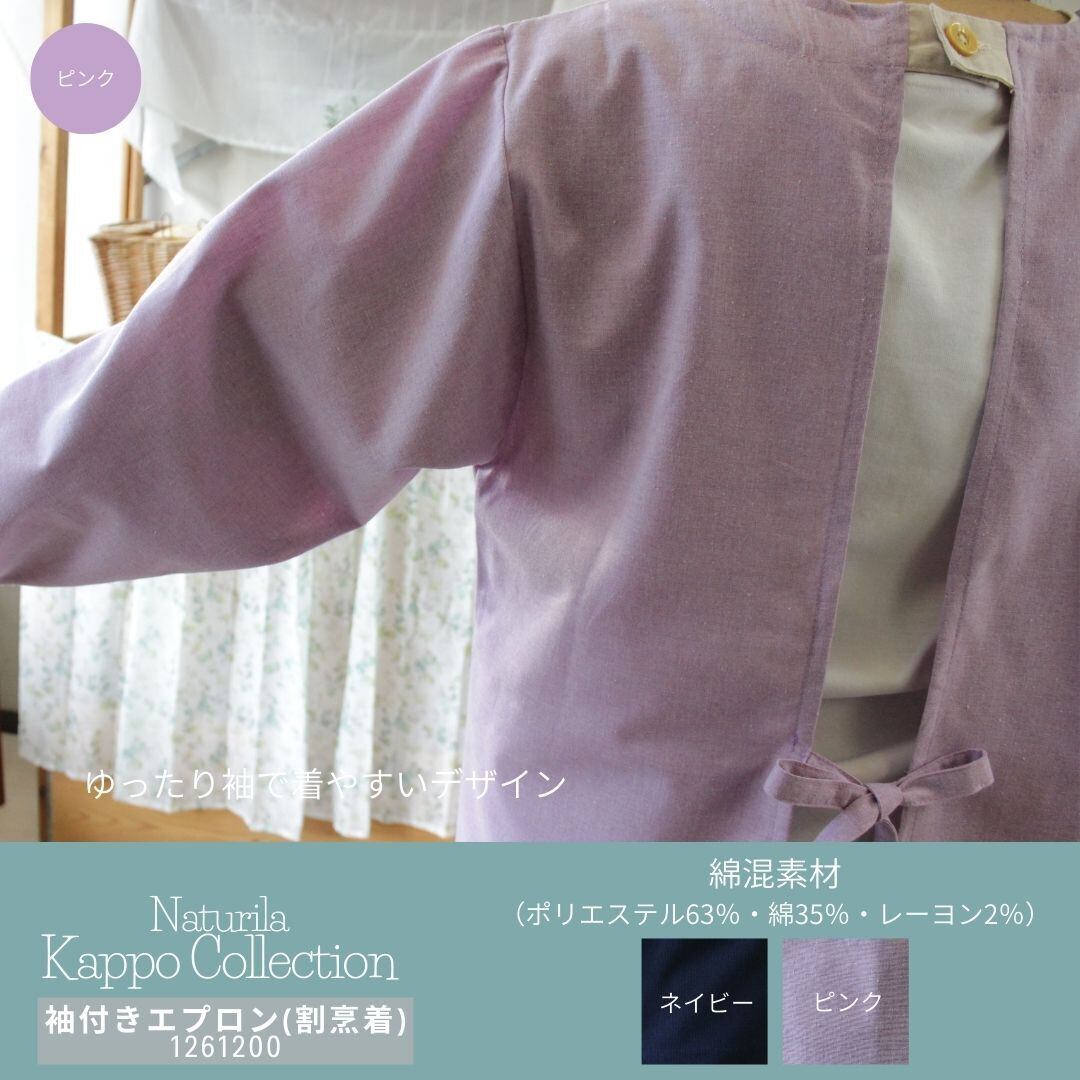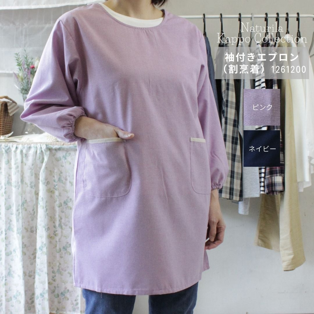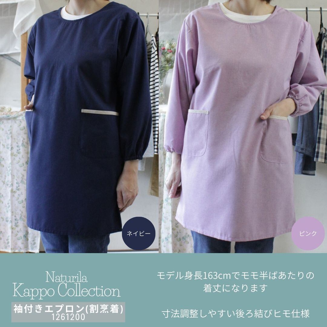 ネイビーとピンクの2色柄展開でキッチンウェアだけでなくそのまま外出着としても使える袖付きエプロン(割烹着)です。