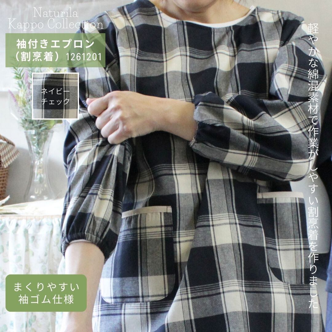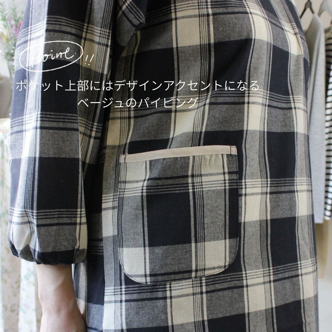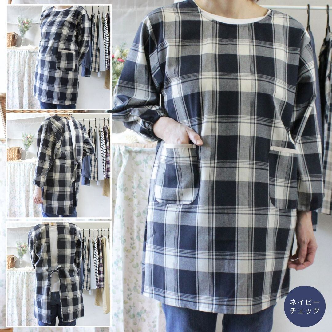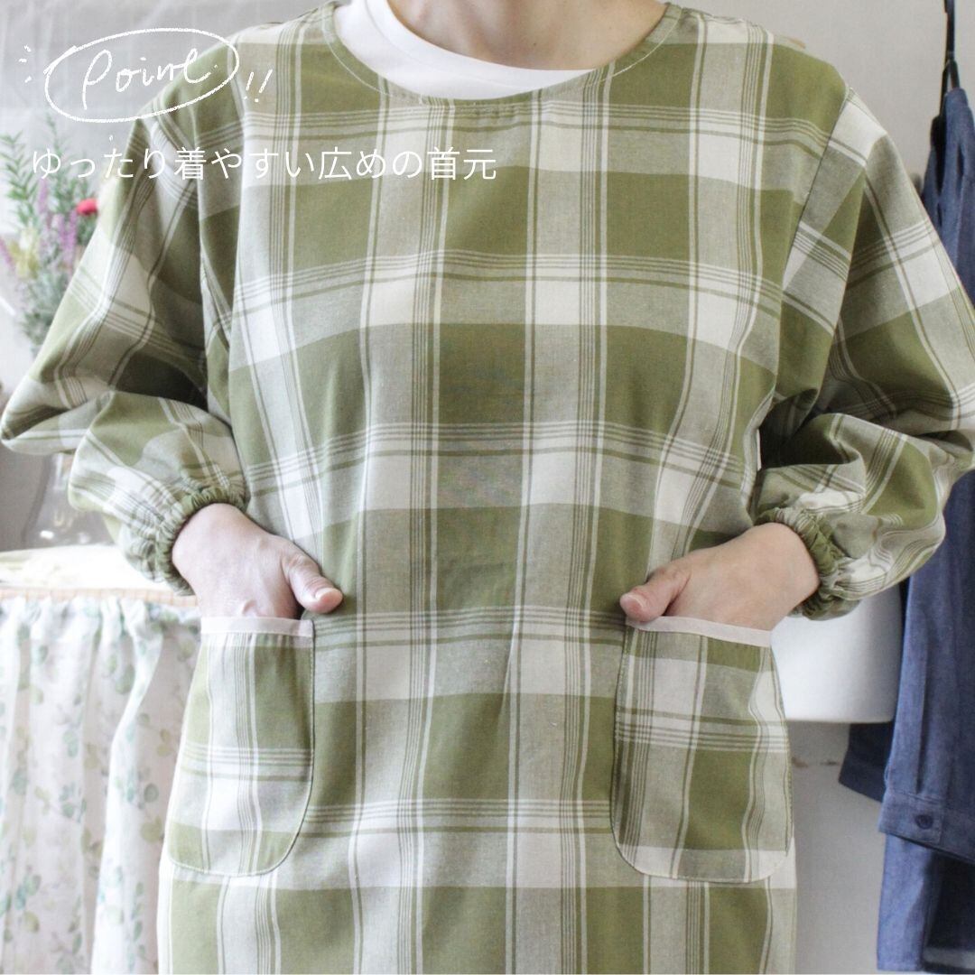 袖口ゴム仕様の割烹着(袖付きエプロン)で、家事だけでなくルームウェアとしてもゆったり着心地&大きめチェック柄がかわいいデザインです。