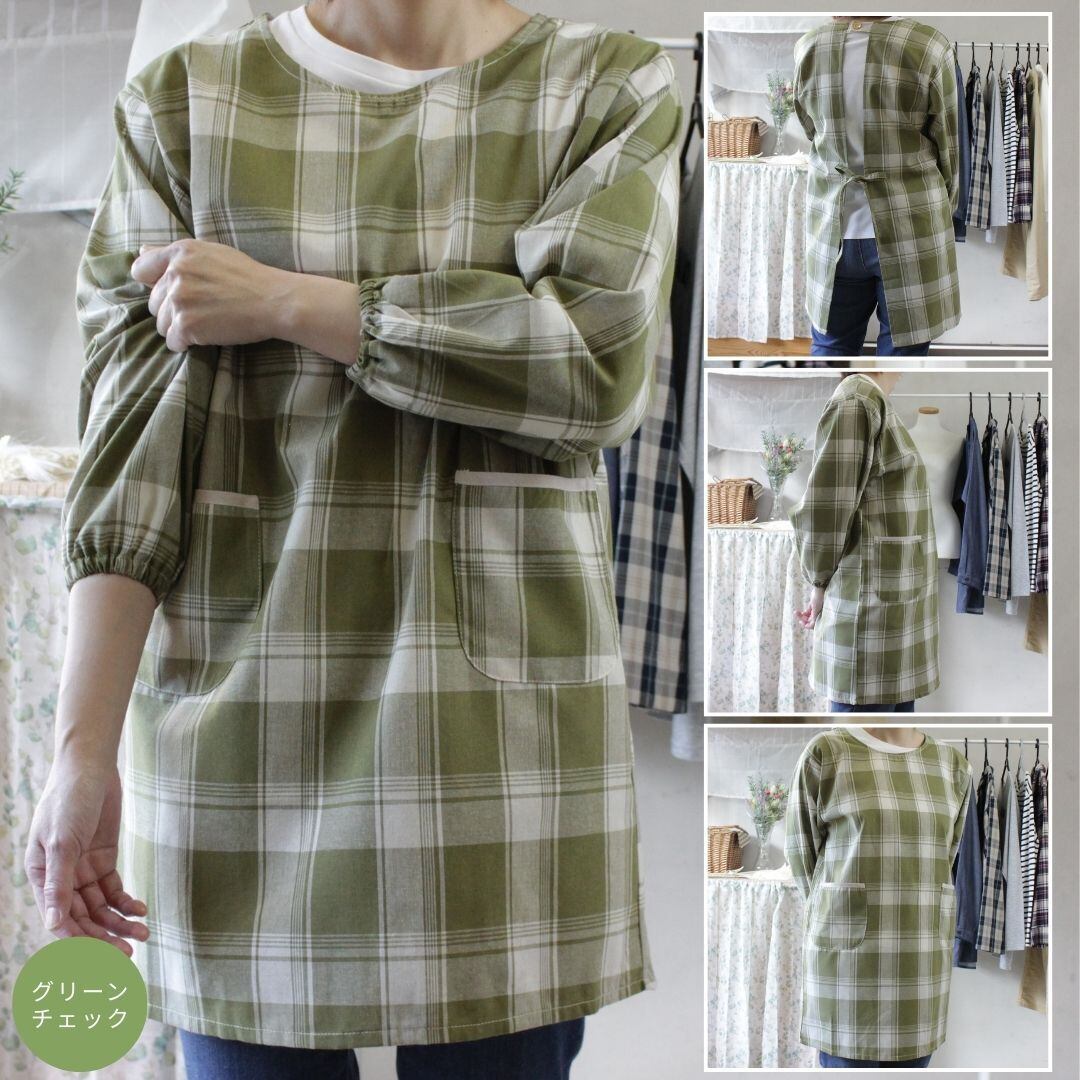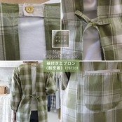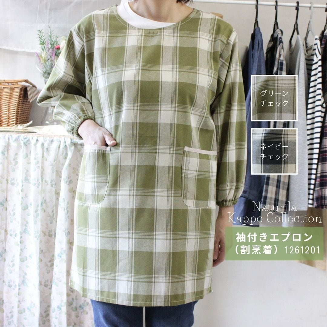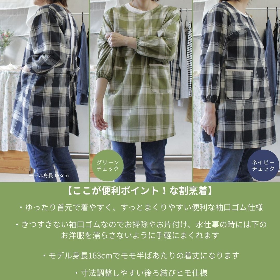 グリーンチェックとネイビーチェックの2色柄展開でキッチンウェアだけでなくそのまま外出着としても使える袖付きエプロン(割烹着)です。
