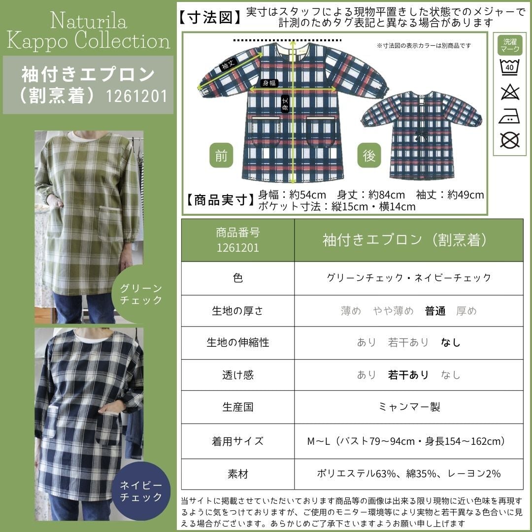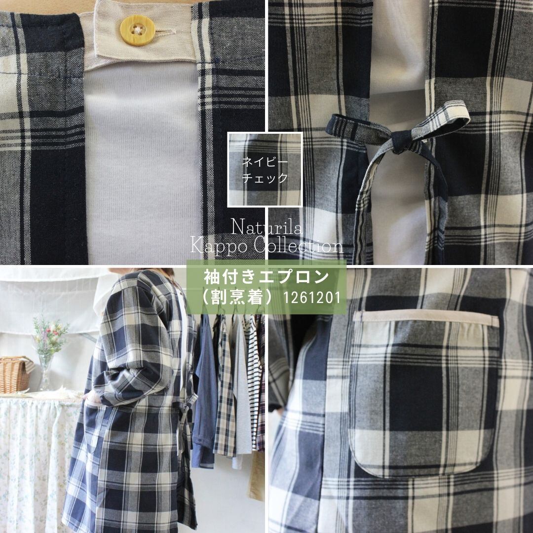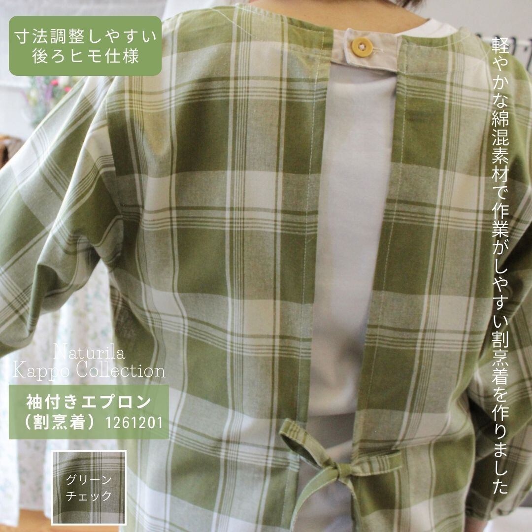 グリーンチェックとネイビーチェックの2色柄展開でキッチンウェアだけでなくそのまま外出着としても使える袖付きエプロン(割烹着)です。