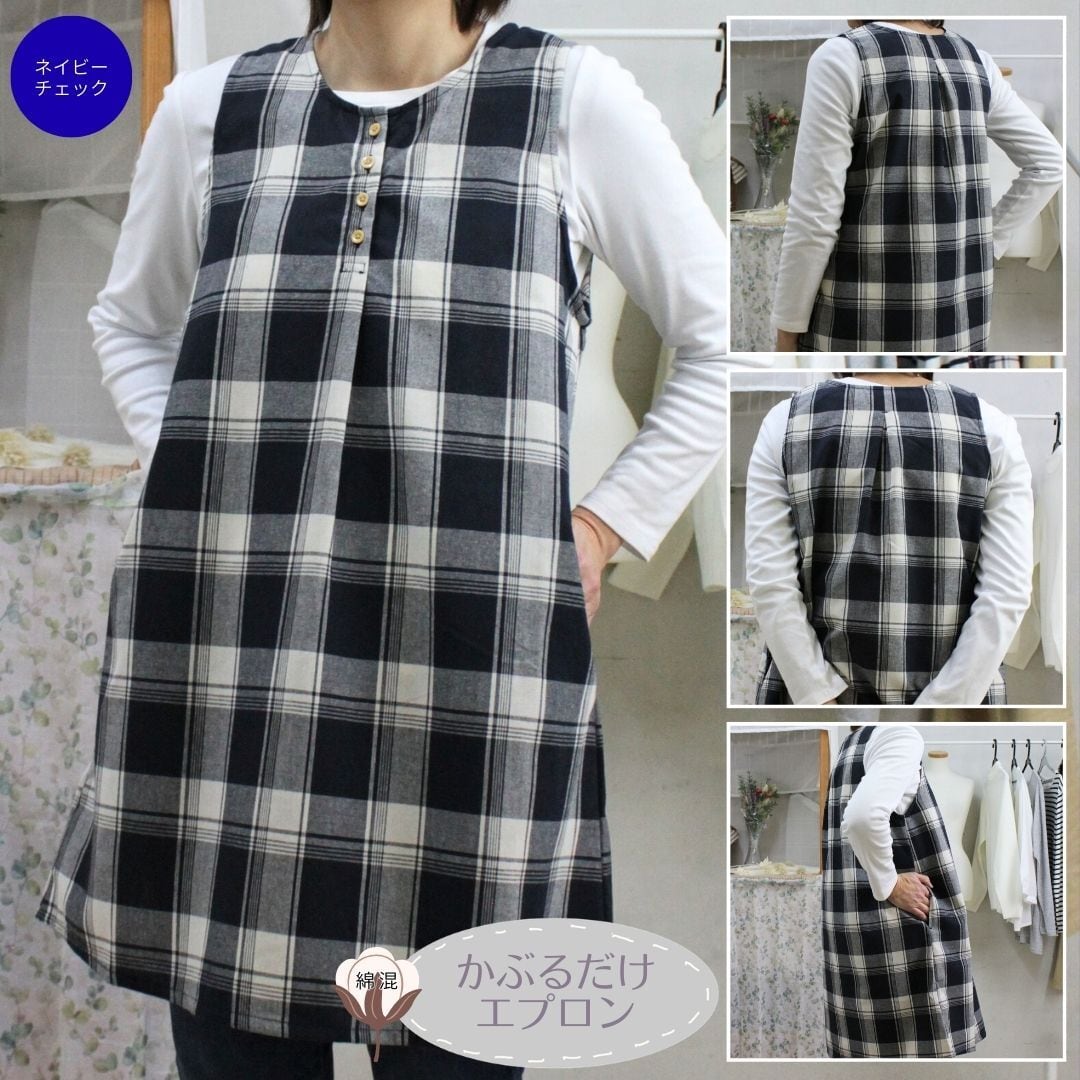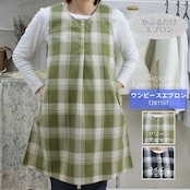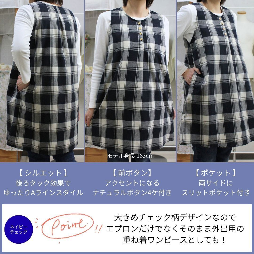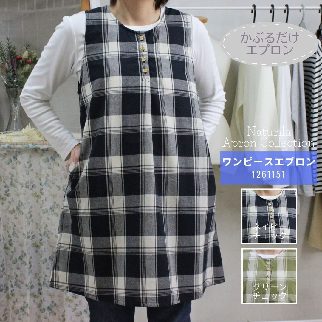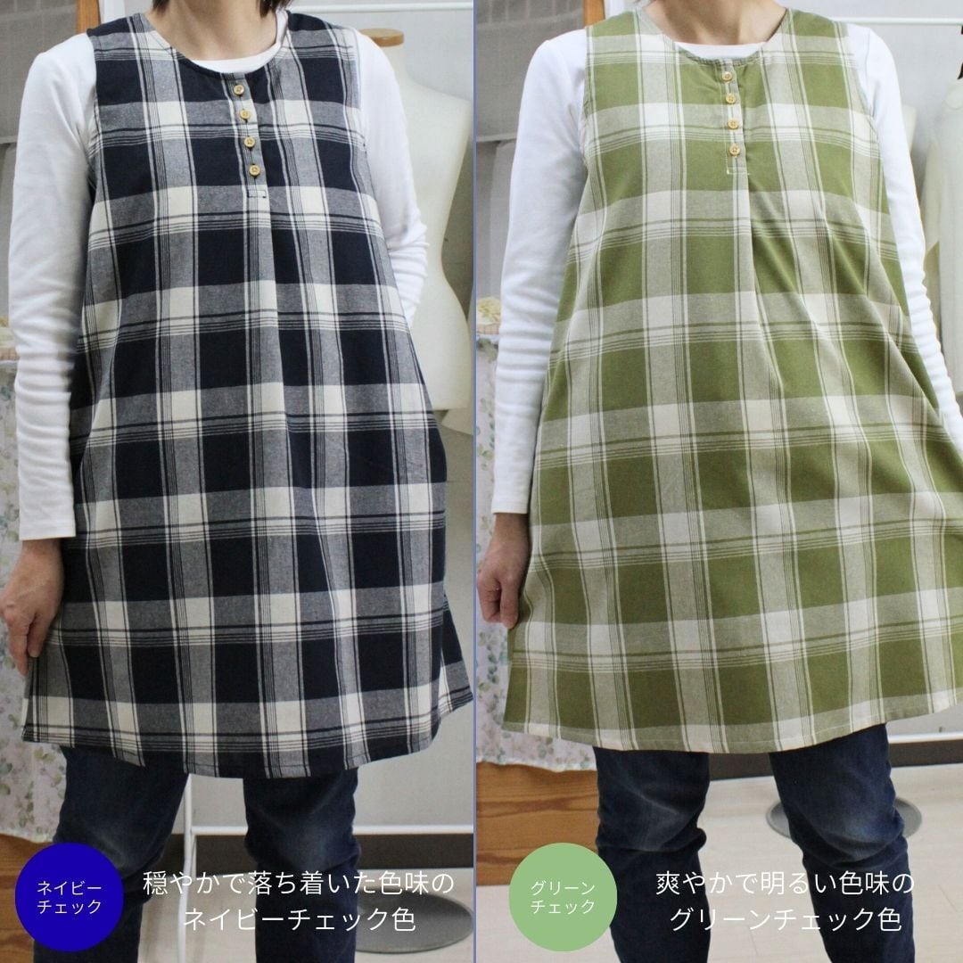 ネイビーチェック・グリーンチェックの2色展開、綿混素材で着やすくかわいいデザインのワンピースタイプエプロンです。