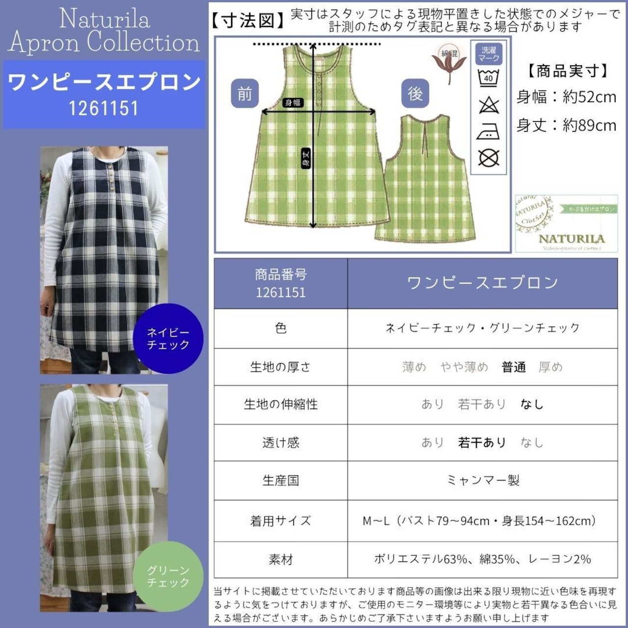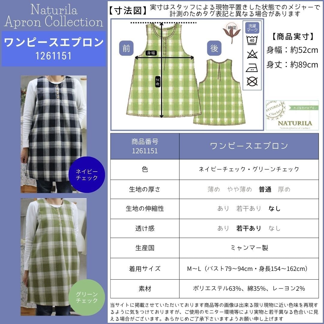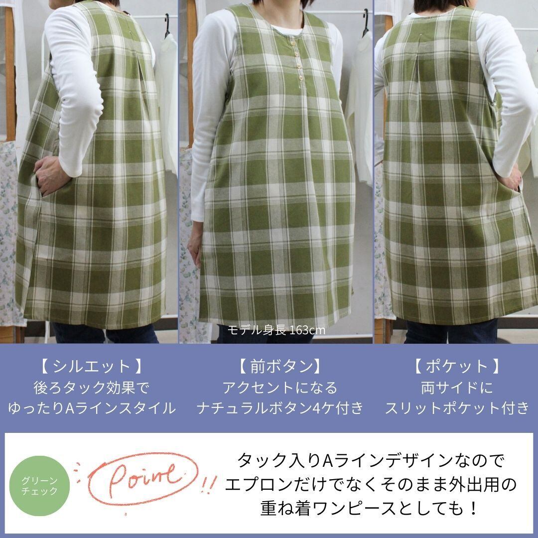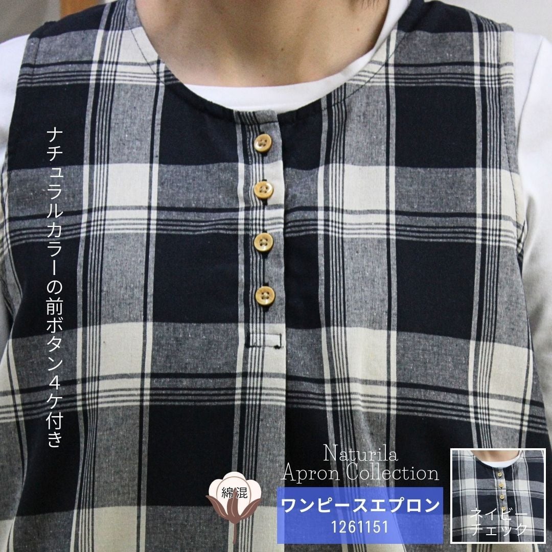 ネイビーチェック・グリーンチェックの2色展開、綿混素材で着やすくかわいいデザインのワンピースタイプエプロンです。