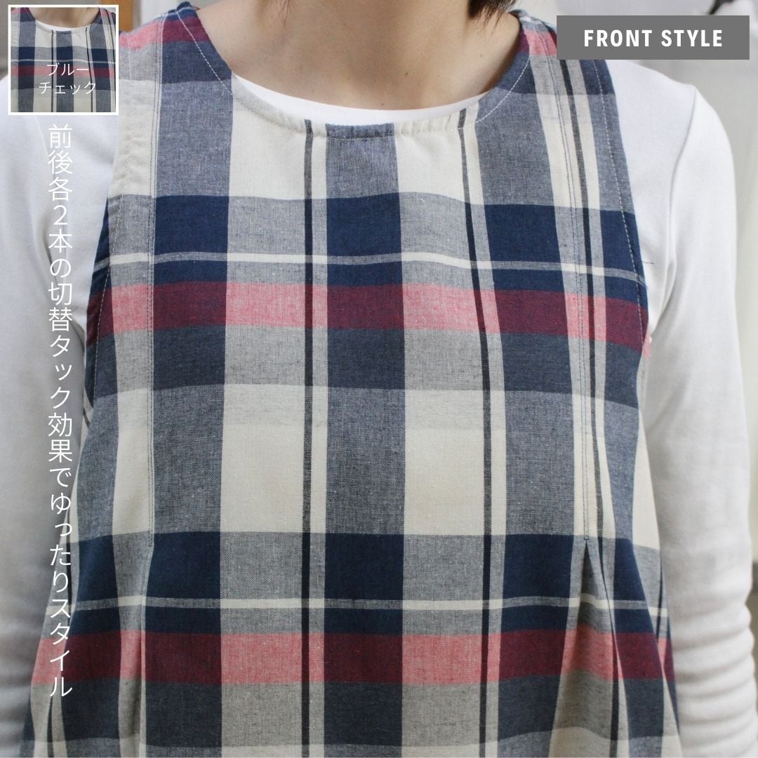 大きめチェック柄が個性的なデザインのエプロンです。前後タック&切替デザインなので家事だけでなくルームウェアとしてもゆったり着心地。