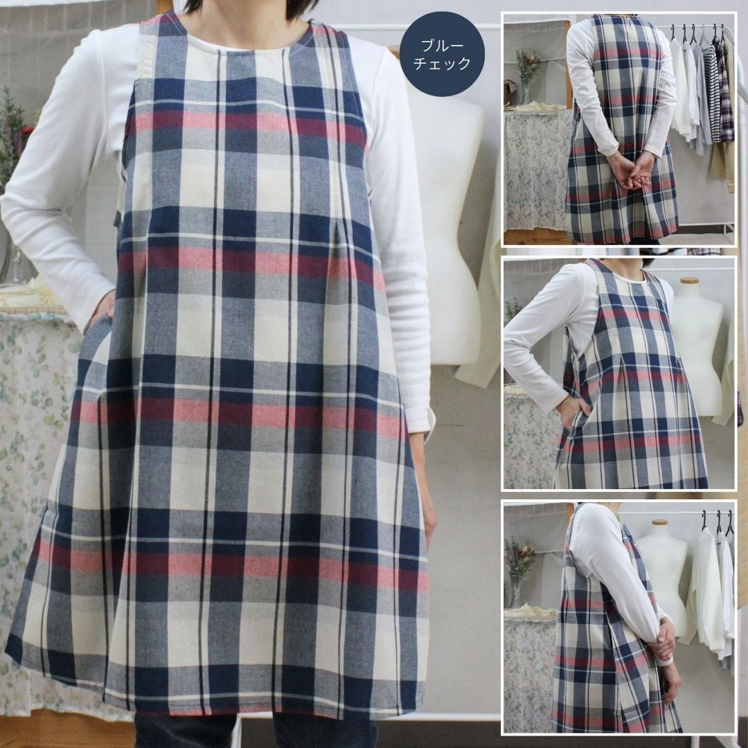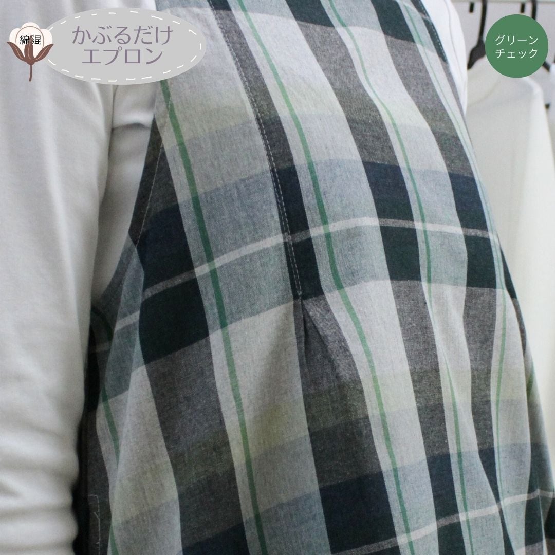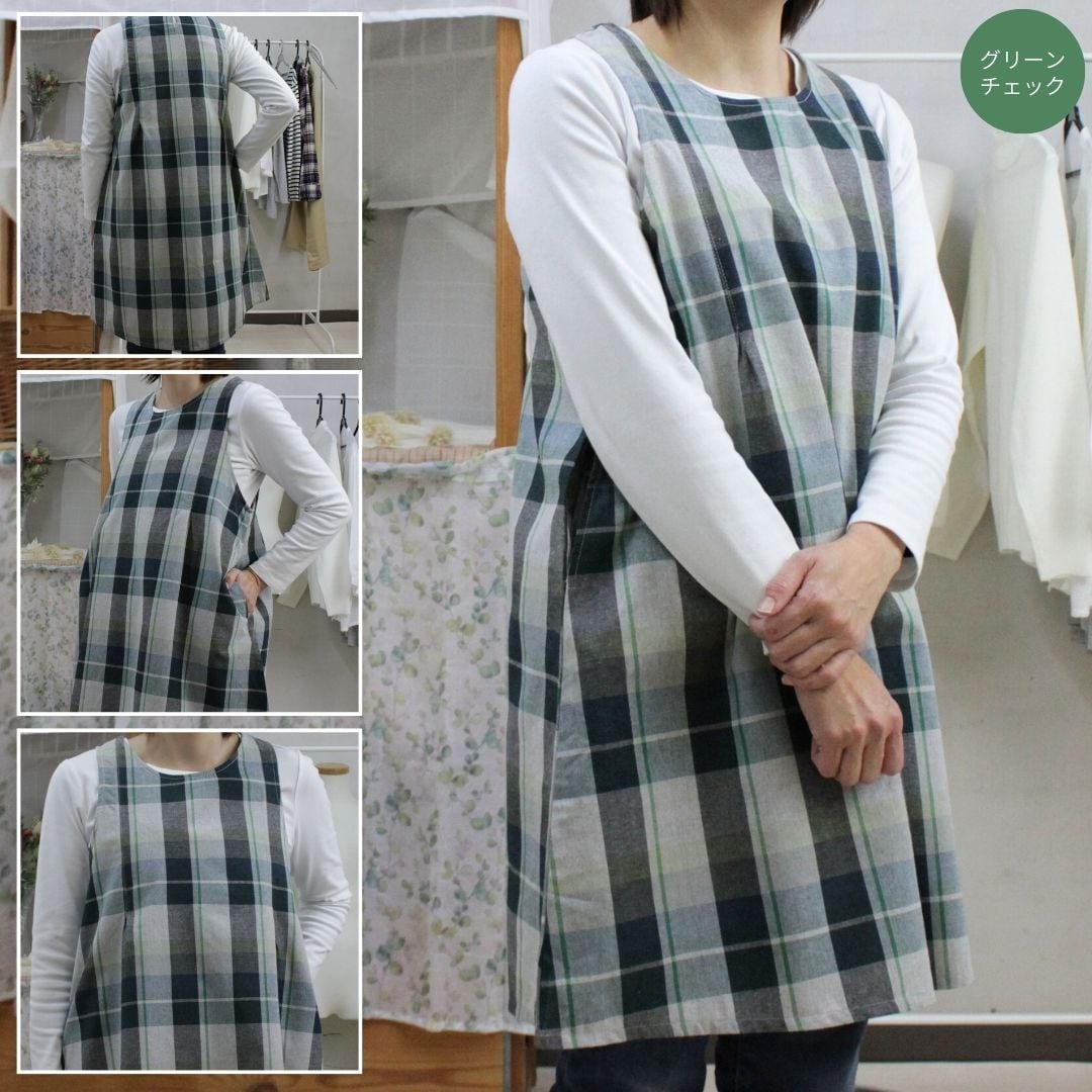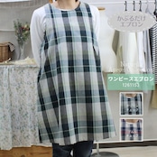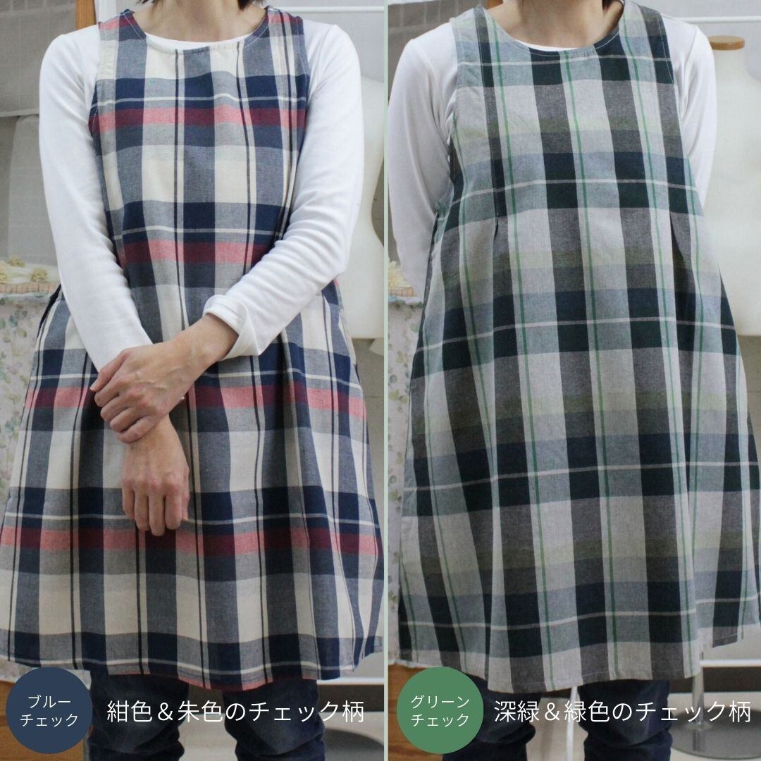 ブルーチェック・グリーンチェックの2色展開、綿混素材で着やすくかわいいデザインのワンピースタイプエプロンです。