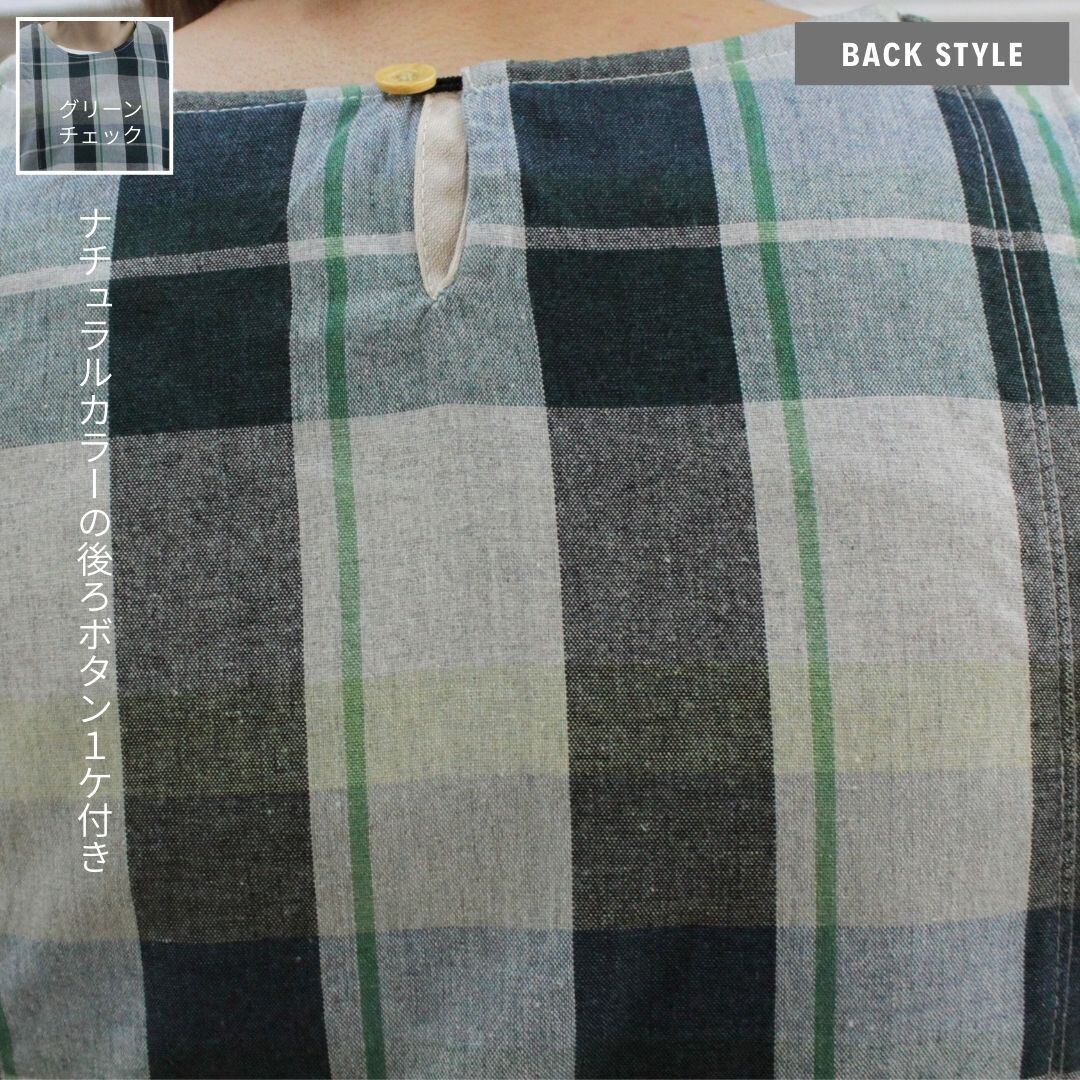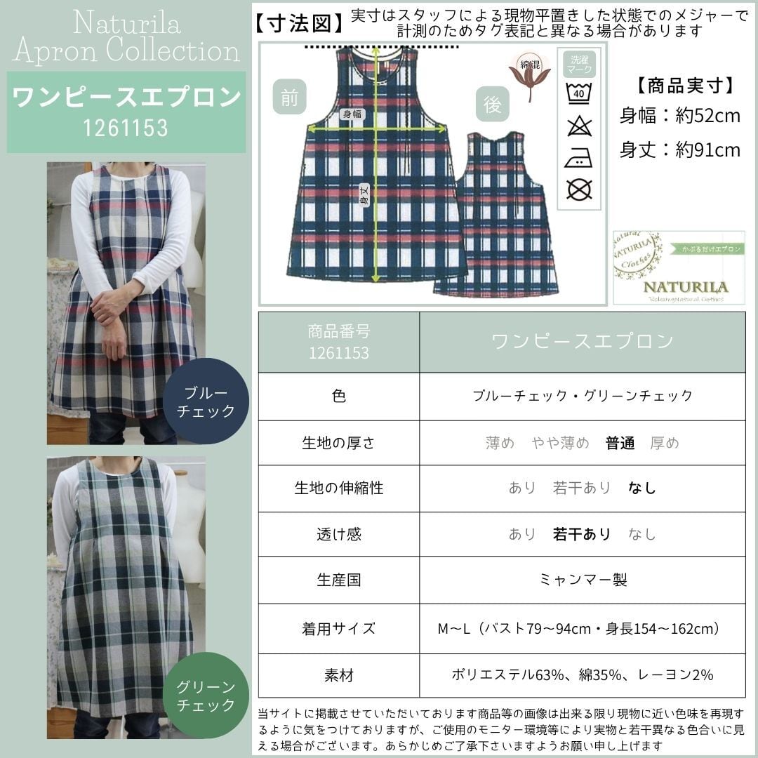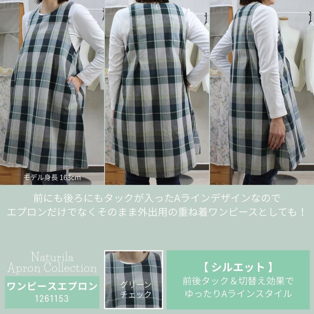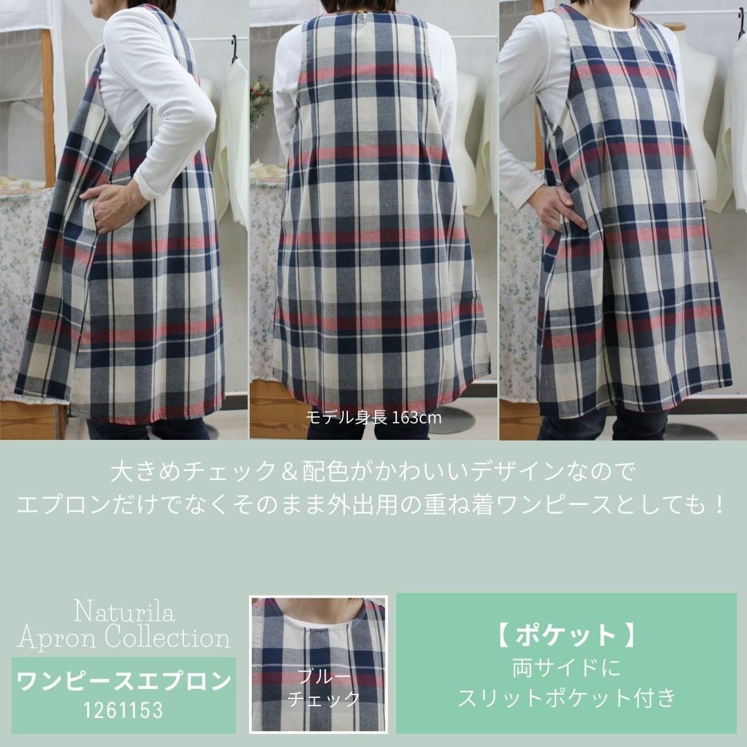 ブルーチェック・グリーンチェックの2色展開、綿混素材で着やすくかわいいデザインのワンピースタイプエプロンです。