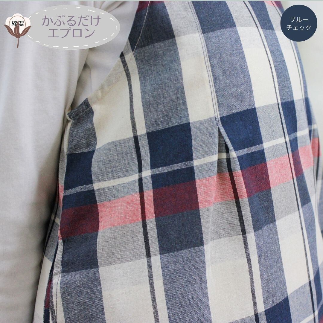 エプロン ワンピーススタイル かぶって着れる ゆったりデザイン チェック柄 ホームウェア 保育士エプロン スリットポケット タック入りデザイン 綿混