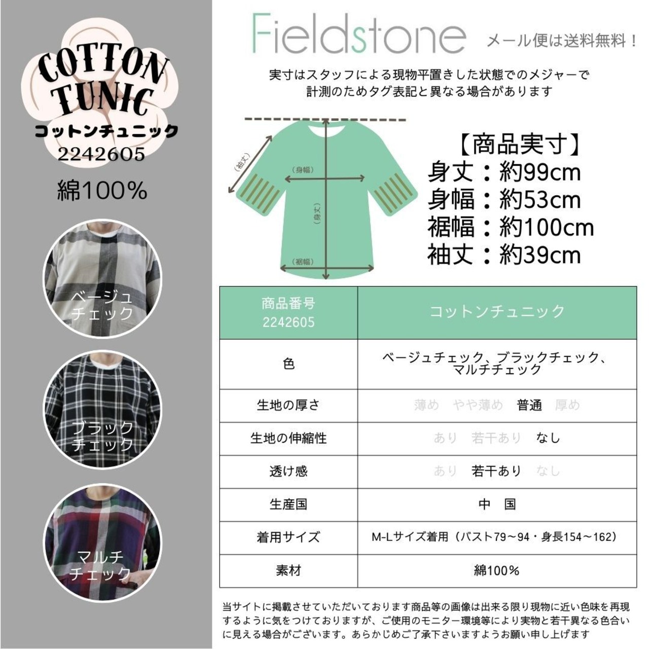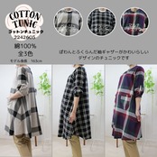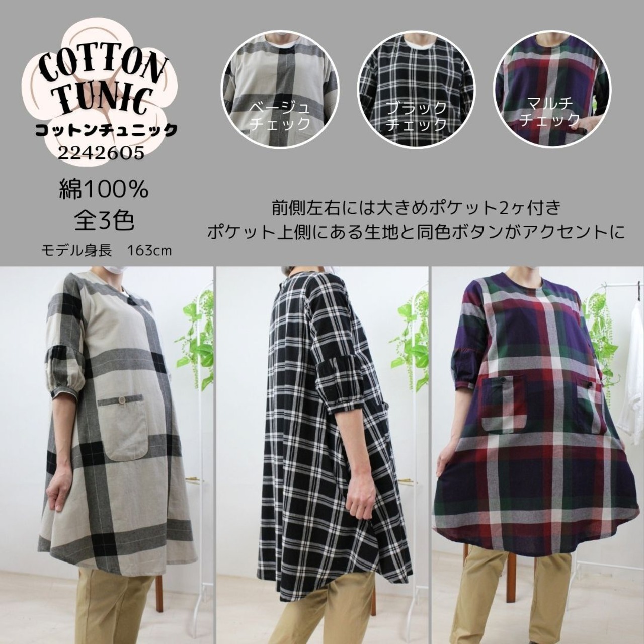 綿100%生地でさらっと着心地。お部屋着から外出着までいろいろなシーンで使いやすいチュニックです。丸首仕様、綿素材、チェック柄、3色展開で手軽に着られます。